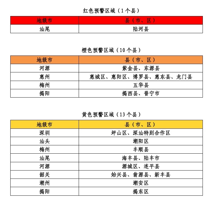 深圳坪山区、深汕特别合作区,汕头潮阳区,梅州丰顺县,汕尾海丰县、陆丰市,河源源城区、连平县,韶关始兴县、翁源县、新丰县,潮州潮安区,揭阳揭东区,局地发生山洪灾害可能性较大(黄色预警)。