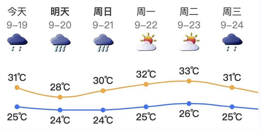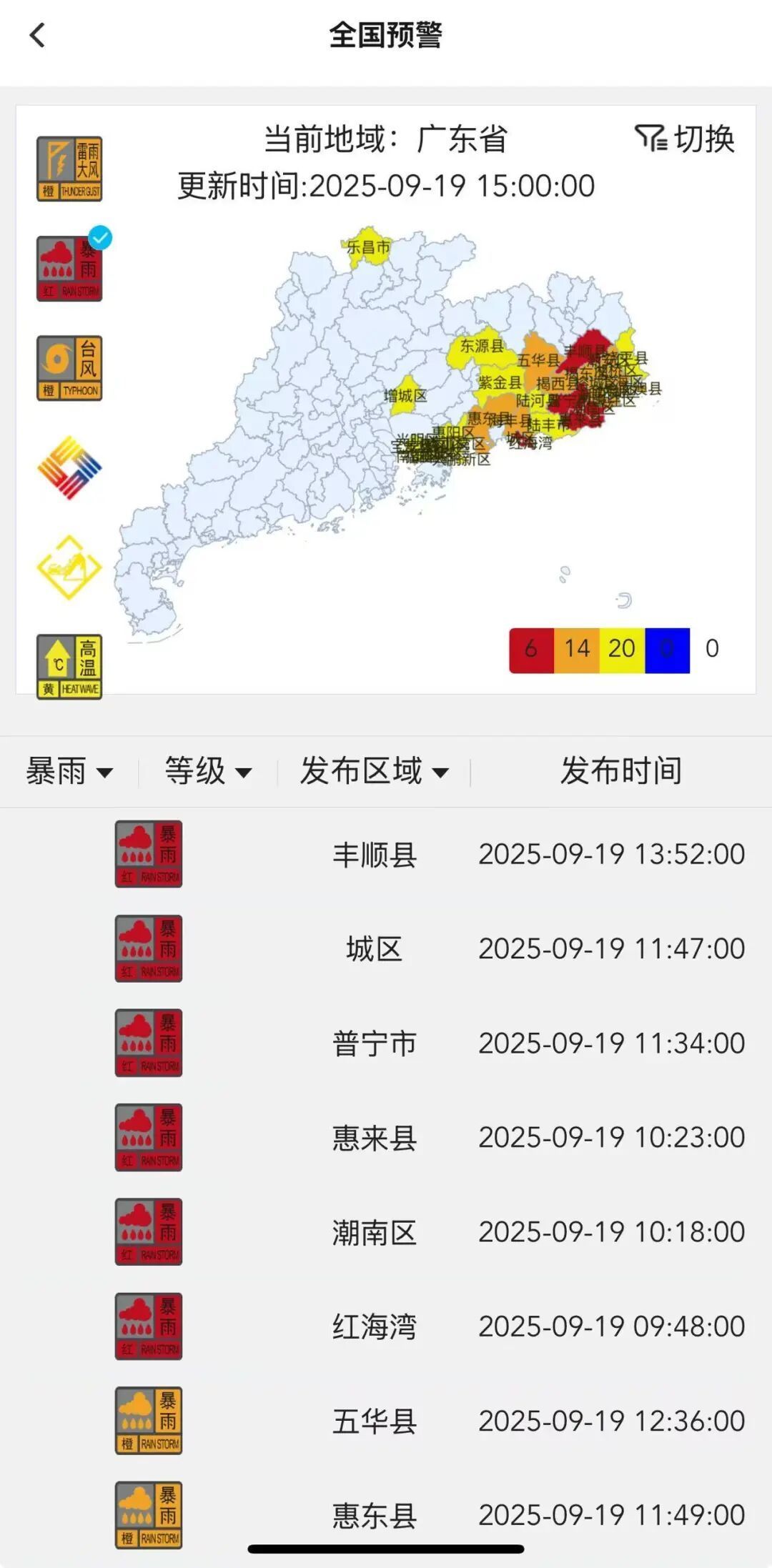 19日,粤东市县、河源和惠州阴天有暴雨到大暴雨局部特大暴雨,梅州、广州、东莞、深圳有大雨到暴雨局部大暴雨,其余市县多云,有(雷)阵雨局部暴雨,雷雨时阵风8~11级。最高气温:河源、梅州、惠州和粤东市县28~32℃,其余市县33~36℃。