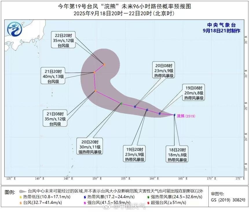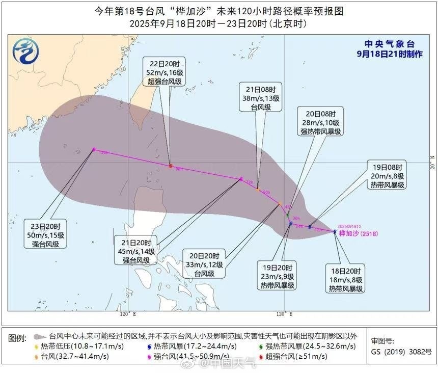【台风“桦加沙”】原位于菲律宾以东洋面的热带低压已于18日20时加强为今年第18号台风“桦加沙”(热带风暴级,英文名:Ragasa,名字来源:菲律宾,意义:快速移动)。