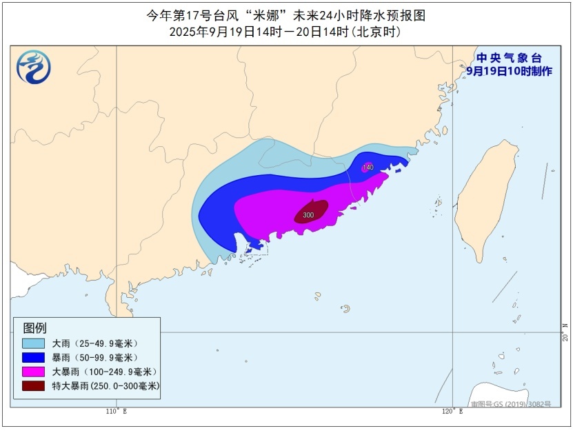 降水预报:19日14时至20日14时,福建南部、广东中东部、江西南部等地有大雨或暴雨,其中,广东东部、福建东南部等地的部分地区有大暴雨,局地有特大暴雨(250~300毫米)。