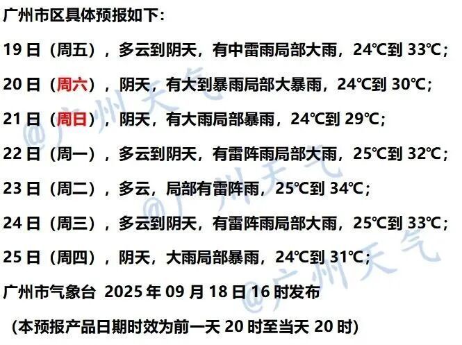 20日,清远南部、韶关南部和珠三角大部市县有暴雨局部大暴雨,粤西市县有雷阵雨局部暴雨,其余市县多云到阴天,有中到大雨局部暴雨。最高气温:粤西大部市县31~34℃,其余市县27~30℃。