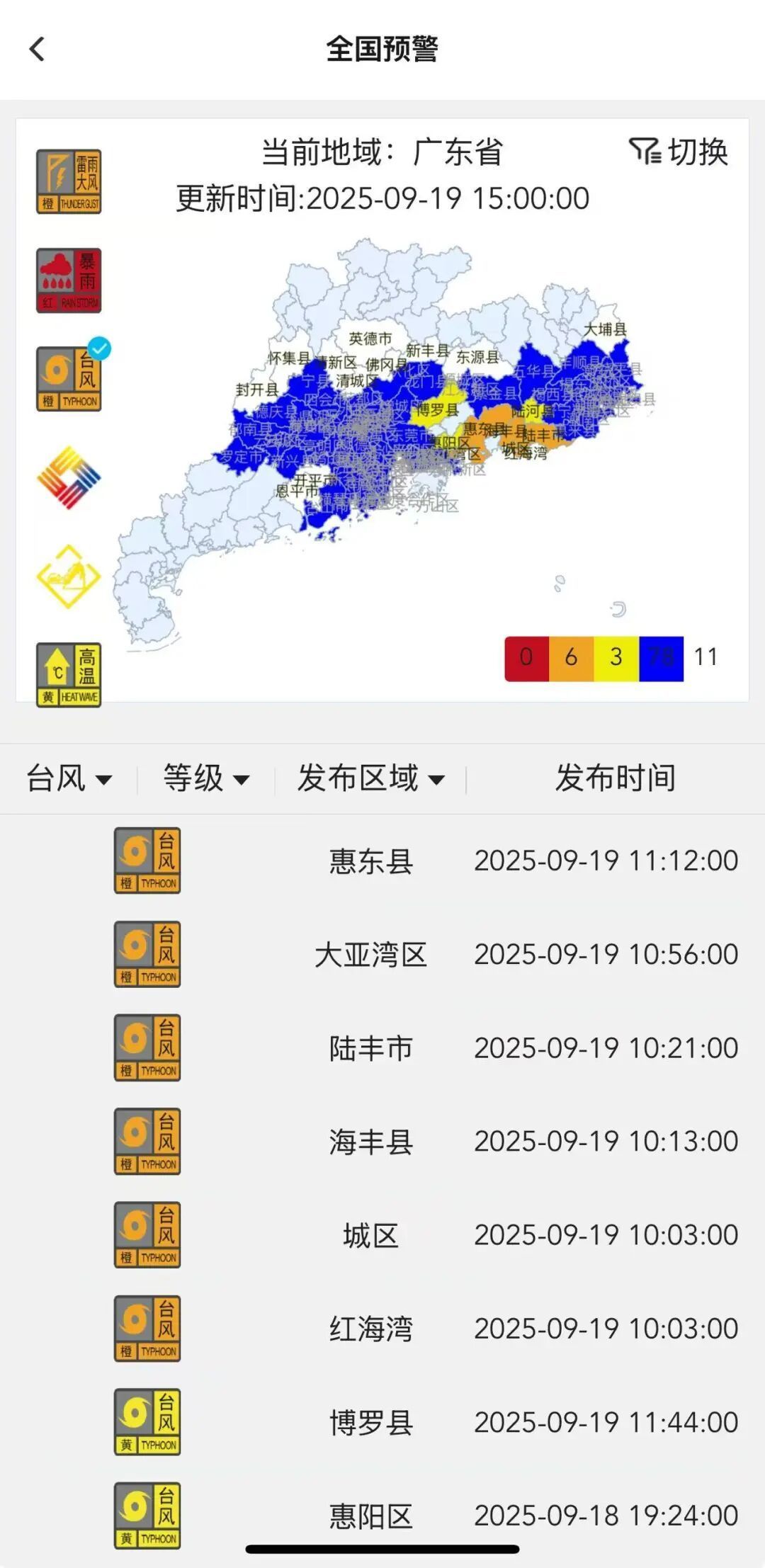 截至19日15时,全省有98个市县台风预警信号生效中(11个白色、78个蓝色、3个黄色、6个橙色)。