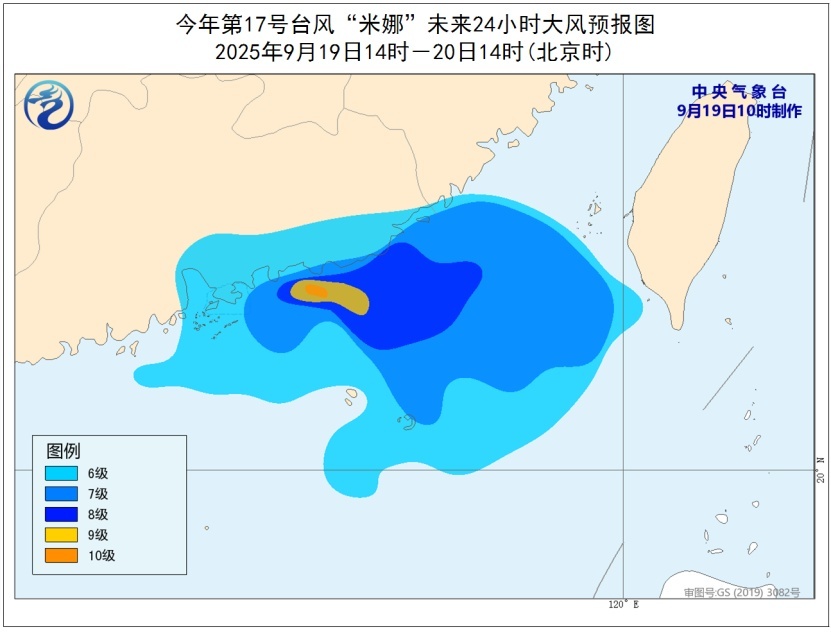 19日,南海东北部和广东中东部海面风力7~8级阵风9~10级,台风中心经过的附近海域风力9~10级阵风12级;